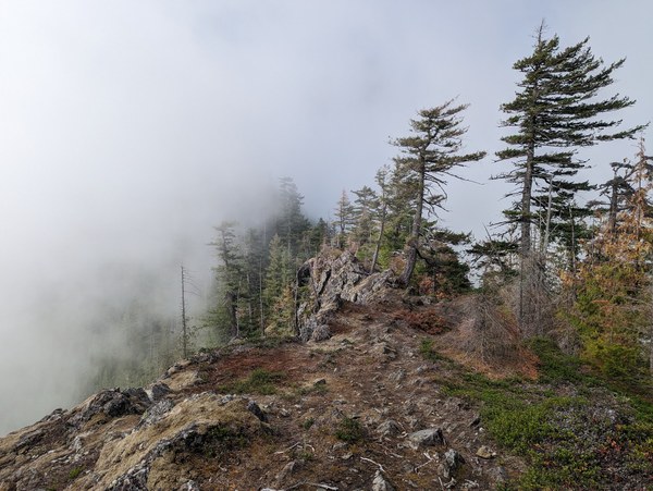 By around 12pm we reached the Eastern Island (47.42138, -121.67098), an object that some have described as "bunny ears" (two narrow blocks of stone standing next to each other). I think it may have been right before that when we crossed the "challenging rock traverse", a narrow section of the ridge where there was some exposure on both sides and you had to take some care where and how you step, but walking on good rock. Due to a bit of exposure, it could be in the upper half of the T3 range, perhaps, or marginally more challenging than an average T3 scramble? I'm not an expert on that, though. It sounds like maybe this depends on one's comfort with exposure. There wasn't anything particularly technical, and the rock was good, dry, and grippy.