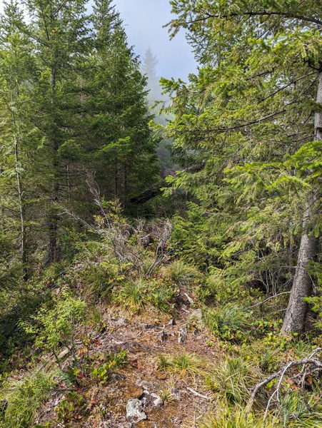 We only stayed on the Iron Horse for about 1200 feet, then shortly before reachign the "Deception Wall" crag we entered a trail on the right side (47.43506, -121.65965), then started ascending.