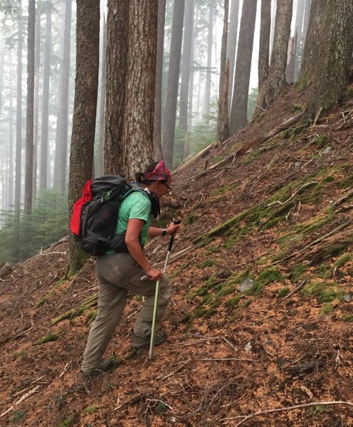 The carbon river road was in good shape for bikes. The Chenuis Falls trail was in reasonability good shape with some trees down over the trail. The off trail part of the trip was mostly steep forested travel under very dry conditions.