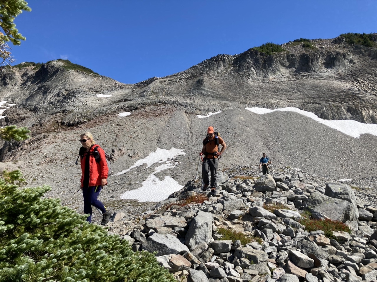 A partially cloudy day gave us perfect temperatures in the 60s and moderate winds most of the day. No ice axes or traction devices were needed, with the still remaining snowfields either low angle or easily avoided. Although drinking water is still available from tarns at ~6600’ SW of Tokaloo Spire, they might be gone in a couple weeks.