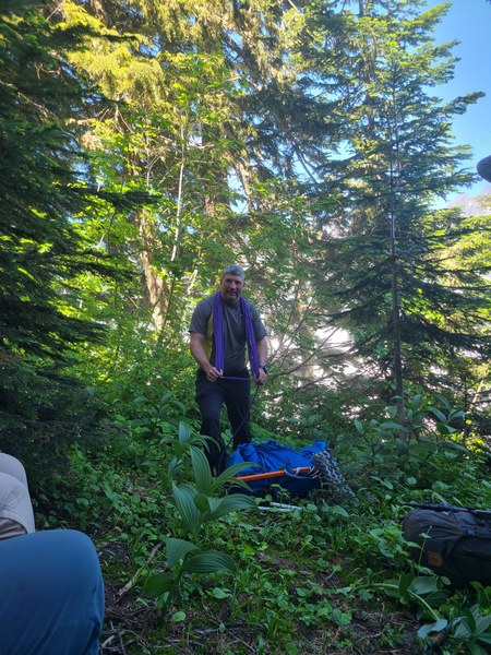 After the entire team arrived we did a quick meet and greet, assigned our first aid person and headed up the trail. From what I have heard the Wagon Wheel lake trail is little used compared to the other trails in the area. Most likely because it is steep and doesn't really offer any views. I have only traveled this trail in winter so this was my first time going up it with vegetation in full bloom. The lack of usage shows on this trail due to how much the vegetation is encroaching on it. There were sections that left some of the participants on the trip wondering if we were still on the actual trail or missed a turn. The worst section of this trail was probably the final quarter mile before reaching the lake. In this section you are surrounded by Devil's club and Slide alder. The slide alder goes over the trail in places forcing you to step over it or on it to continue.