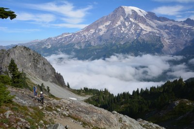 For today's trip we made an early start out of Longmire. Much to our surprise even with the early start the Longmire parking area was over half full. I guess this was to be expected on Labor day weekend. From the main parking lot we elected to hike the road over to the Eagle peak trail instead of taking our cars to it. This parking area is small and we did not want to crowd it with just our vehicles. Once at the trail we took it on up to around 5,000 feet where we acquired the climbers trail to Wahpenayo peak. This trail is obvious if you look for it at the switchback in the large clearing that you come out into at this elevation.