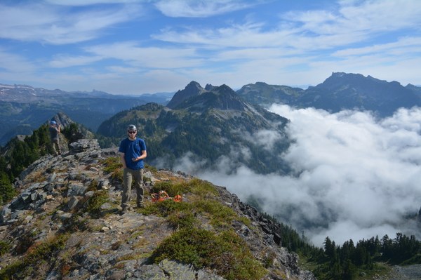 After a short break we started up the ridge to Wahpenayo peak. There is a very good boot path that you can follow all the way to the peak along the ridge. You may lose it in a few places but when in doubt look up since that is where you need to go. We made quick time to the actual peak, stopping here and there to enjoy the views of the other Tatoosh peaks as well as Rainier which was behind us at this time.