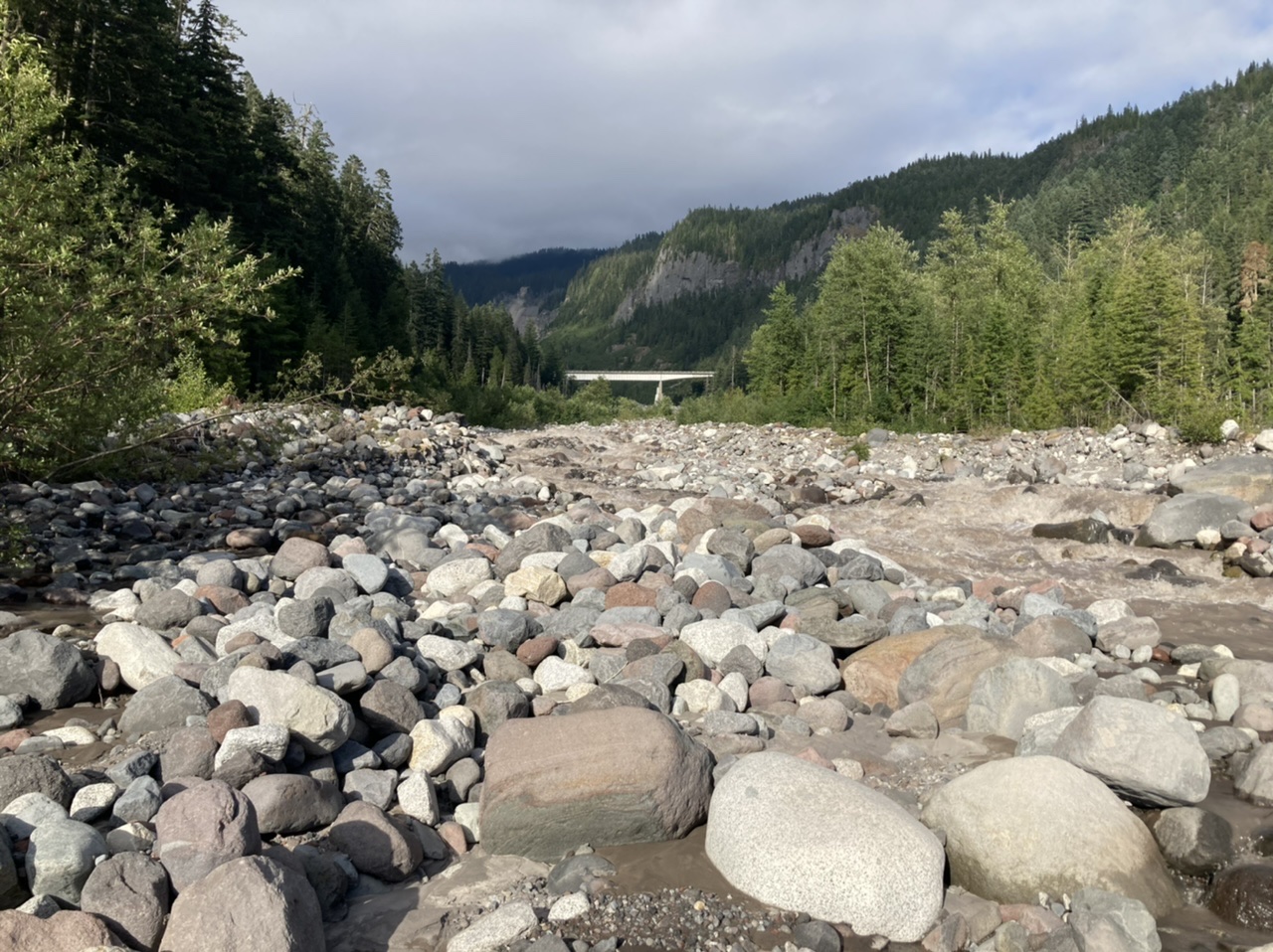 … there was negligible evidence of this road bed (other than a set of curious cables) between Christine Falls and the Nisqually Bridge. Ultimately the brush forced us to rock hop along the Nisqually River (with a few diversions)…