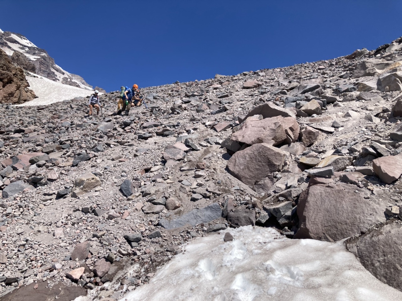 Early morning fog/dew led to wet meadow brush which dampened our clothing and boots. Interestingly it left us with sticky arms/hands causing us to think of some kind of pitch? As it turned out it washed off easily with cold stream water. We brought crampons and did not use them (although came close a couple of times around ~8000’). The cleaver crossing at ~8200’ had the usual chossy talus/scree which might have been less so with a traverse at a respectable distance above the cliff band (due to a lower angle of repose, orange line in this photo):