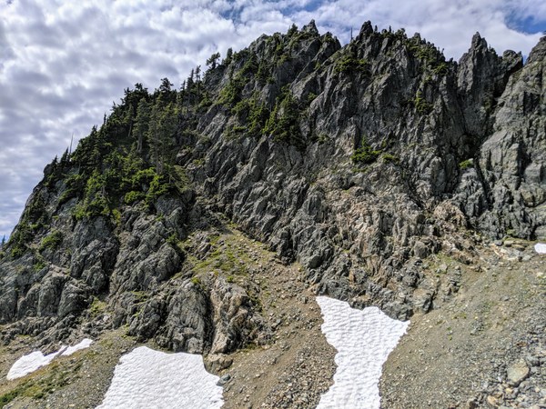 Traveling from Chair Lake to Kaleetan Peak required snow travel around the lake and up another steep gully. We could hear a stream below the snow at the bottom of the gully but we experienced no post holing as we moved conservatively. We traversed through another choosy rock field past the gully towards the White Ledges of Kaleetan.