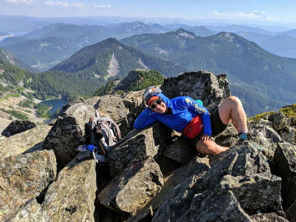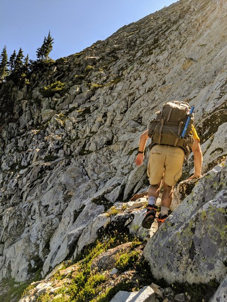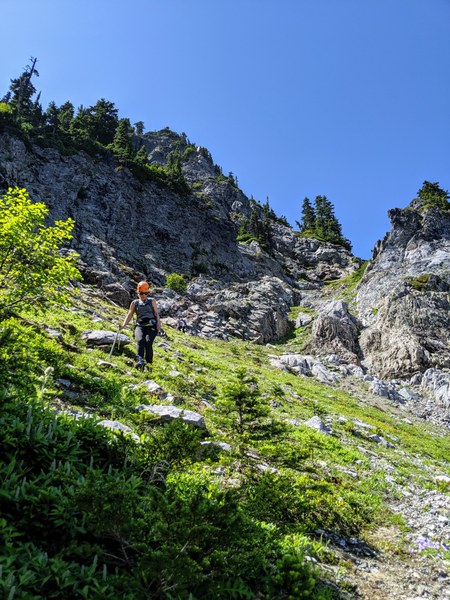 The White Ledges were super solid for scrambling. There was very little loose rock here and we only had helmets and our mountaineering boots for specific gear. The route up to the summit of Kaleetan was fairly straightforward and solid. There was exposure but I never felt unsafe. The summit views were gorgeous from Kaleetan. We down climbed with no issues and took the long way to Melakwa Lake which required more route-finding.