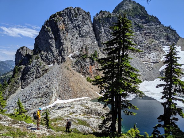 - Chair Lake was really nice for a water refill. We then scrambled around the lake and up the gully towards Kaleetan Peak. The snow was solid for the most part with some thinning at the bottom of the gully. No postholing though.