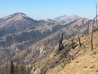 The burn from the Jolly Mountain fire is quite spotty, with just a few area completely charred. The trail has recently been logged out, and so is not blocked by downed trees.