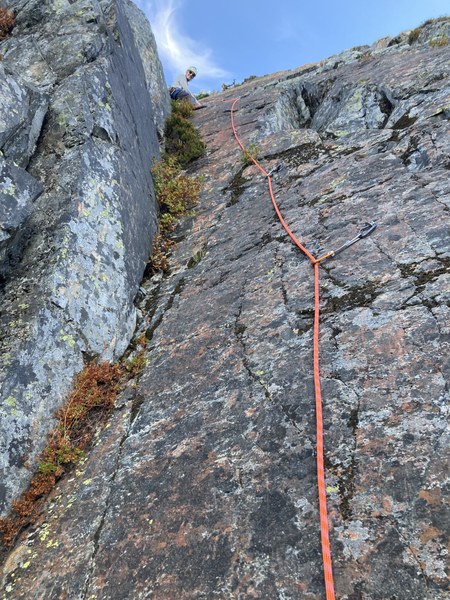 We were going to rappel off the anchor on the red route, but after some exploration, I spotted the anchor in the middle of the yellow route, the route next to the arete. We scrambled down to that ledge, and our 60 m rope was just long enough to get down off the rock from there. Didn't really notice any bolts below this anchor, so that's why we didn't see the route when we approached.