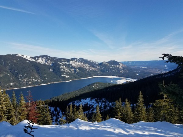 It was a bluebird day. The mountains were above the fog layer around Seattle. The trail was groomed the whole way. It was sunny. The tracks were good for going up. The views at the top were of the lake and Mt. Rainer. The skiing down was easy with the soft conditions.
