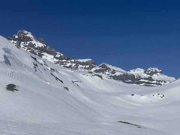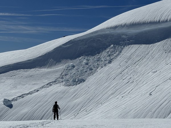 The most heart pounding part of the day was passing below a large cornice feature which was calving due to the warm temps. We gave it a wide berth, took it one at a time, and moved quickly to minimize exposure. The risk was also mitigated by the "hot pow", the couple feet of recent snow that was by this time of the day pretty warm and preventing rollerballs, cornice debris, and us from moving too far through the mush!