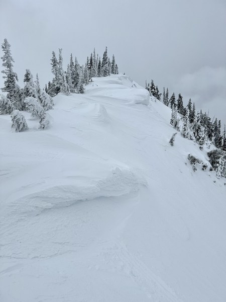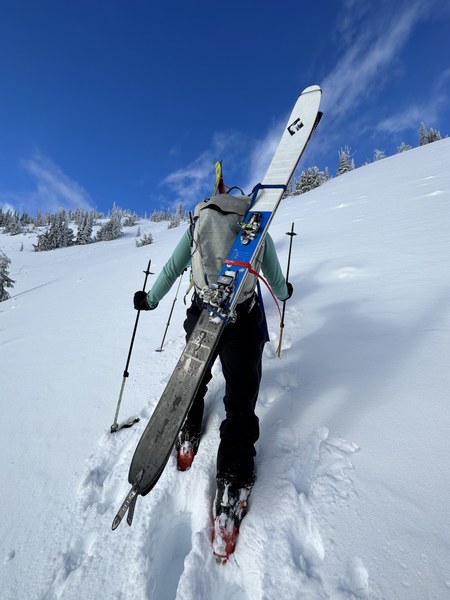 On the one SE aspect we skied in the Morse Creek basin, the fresh snow formed a thin layer over a hard crust. Lower down (~5800'), the thin layer of fresh snow became brittle and would break up and slide off. Skinning back up was unpleasant, with neither the thin surface layer nor the crust providing good traction, so the group opted to boot back up to the ridge top. (This is a good reminder to ensure that participants carry ski crampons and have packs that can carry skis.)