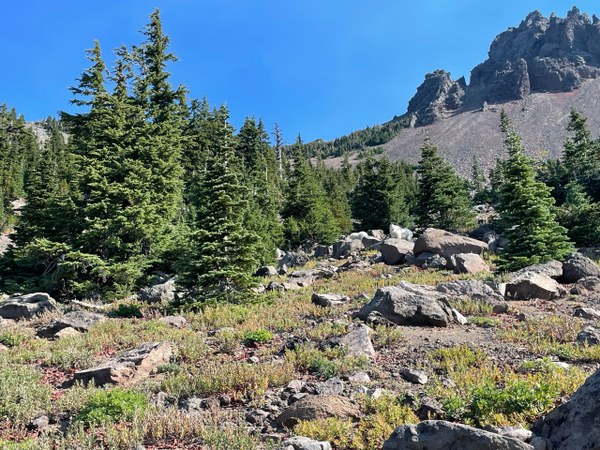 The trail then enters a more forested zone and then scree fields below the west face of Three Fingered Jack. This section was jaw dropping! Gorgeous and would make a good if long day hike. You then climb up and over a small ridgeline which you descend on sharp switchbacks on loose gravelly scree. Fantastic views of Three Fingered Jack abound. See picture above!