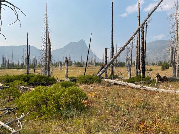 However, once you continue on you will enter a burn zone north of the mountain on the PCT. Here there are numerous blowdowns that are tricky to navigate and get over/around since the whole area is littered with downed trees and debris. This section chewed up a lot of time for us.