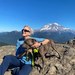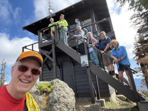 Day 1 - We met at the Puyallup Park and ride at 7am. We convoyed up to the Trailhead and got there around 8:45 am. The parking was pretty sparse, but could see that some spots would open as we passed people that were coming down as we were going up. We started our 8 person trek up to Lake George from the West Trail head about 9:15 am. The ascent was mostly on a gravel road next to the river, and the next 1.5 up a nice steeper trail. Perfect and soft under our feet and big trees provided ample shade from the sun. No big rocks, could actually look around and walk at the same time. Got to the sparkling Lake George around 11:30am and set up our tents in the permit required Group site. A little small for 8, but brought us closer together. :) We explored the area to find a nice toilet, amphitheater (in case we wanted put on a skit), bear poles, and 5 other nice camp sites that require a permit on a first come first served basis; the trails were nice throughout. After a little lunch we headed up 1.5 miles to Gobbler's Knob. Pretty steep but not really rocky till the end. The lookout was neat. Locked up, but we could walk around the outside. Clouds were around the mountain, but would clear with window views. It was pretty cool.