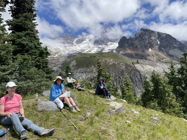Day 2 - We leave camp around 8. We stop at the Marine Memorial on the gravel road and pay our respects then start our adventure down the Round Pass Trail (South Puyallup River Trail); our destination; the Basalt Columns. WOW! never seen rock formations like that. Natures finest!!! It was a great place to snack with a nearby outdoor toilet. (The kind you can pull out your camera and take a picture of the view) Still early, our leaders suggest an option of continuing up to the Wonderland Trail. Duh! How could we say no?! So off we went! Plenty of up and down elevation and a little scary part for me up to Emerald Ridge. The trail at one little peak was very small, maybe 12 inches across with dry dirt, with a huge drop off into the Tahoma Glacier; No worries though, I'm (the one a little afraid of heights) still here! :) At the top, we settled in a meadow for lunch. The views were absolutely phenomenal! This will no doubt be the closest I get to the top of Mt. Rainer. Wow! The dirty and white glacier's, the rivers running through them, the waterfalls....WOW! Just WOW! (My "word" for this trip....WOW!) A few hikers passed through as we sat amazed. After about 1.5 hours we headed back down, up and down, and up and up again. Lots of work, but we made it back to camp, physically tired, but our adventure was well worth it. Definitely one for the books.
