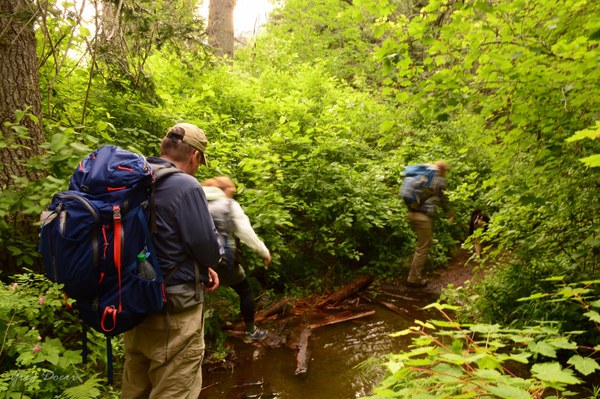 Starting within a quarter mile of the campsite turnoff, we encountered significant and prolonged trail obstructions – fallen logs, overgrowth, and swollen streams. We continued for about one and one-half miles, before the trip leader and I decided to turn back so that we could cook before it got dark and started raining.