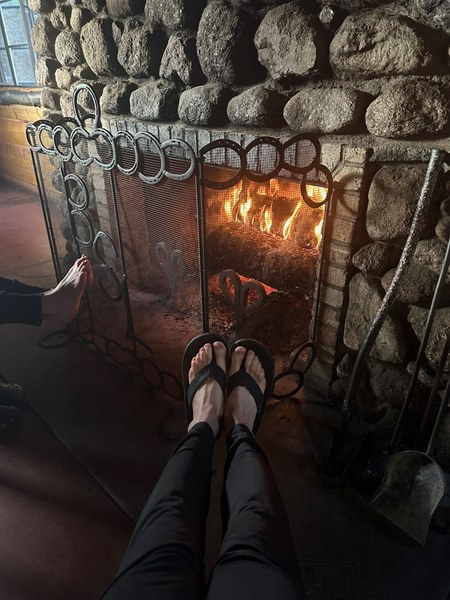 After an overnight at Big Sandy Lodge, with showers, real beds, and a dinner of cheeseburgers, potato salad, and blueberry cobbler, we were treated to a morning of coffee by the fireplace and pancakes: