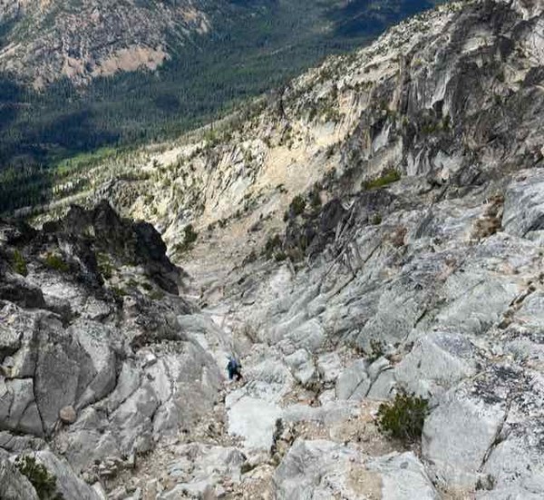 We rappelled down the crux section. Be careful as the extended rappel could get stuck on the chockstone, and you may pendulum. Descended the way we came. Be extra careful of rock fall due to exhaustion and scrambling down hill. Our team at times became over extended, and we had several incidents of rock falling toward team members. Make sure no one is in your fall line and/or stay close together. Stay to the skiers left once you reach the forest, and constantly re-evaluate your route to make sure you are following the easiest path. We reached Ingalls creak at 8pm.