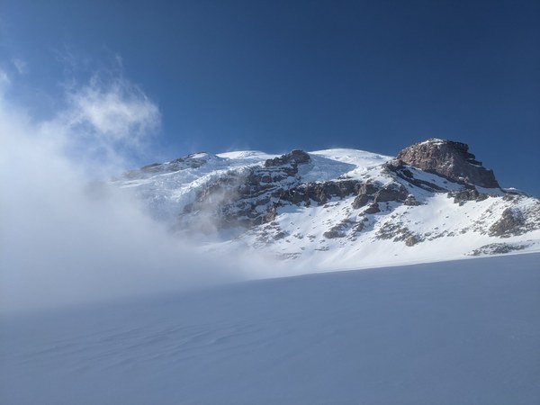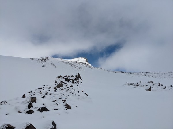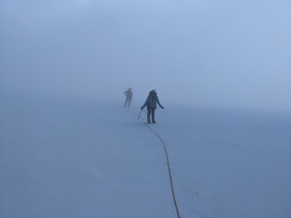 Indeed, our route up the snowfield was in the fog and in the clouds all the way, with ~10-30 foot visibility, but we were prepared for it, so we pressed on. Some time after we stepped on the snowfield, the winds let go. It was still very chilly, but not getting blasted in the face was nice.