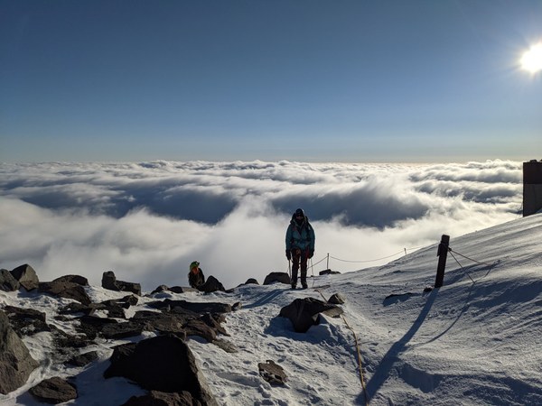 Cold, windy, icy, and in a whiteout all the way, but winter scrambling route in pretty decent shape, and we enjoyed our hard-earned views from above the clouds.