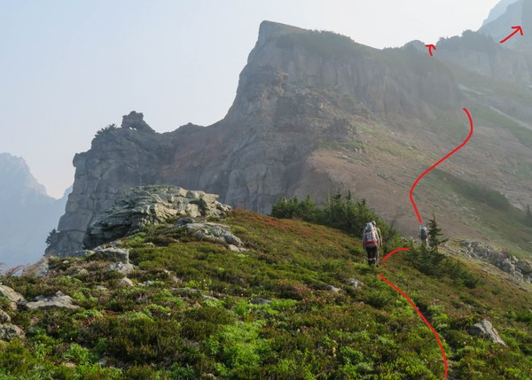 At the top of the gully, traverse climbers left on a ledge. Photo taken on the return.