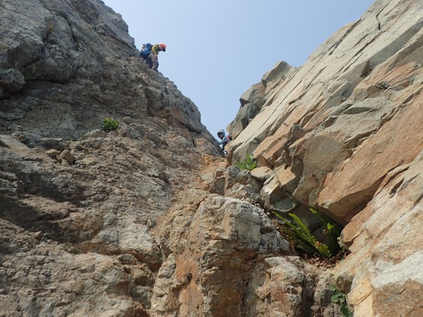 Climbing up the gully with loose rock. There are 2 with the first being much more solid.