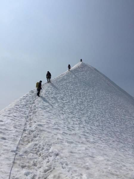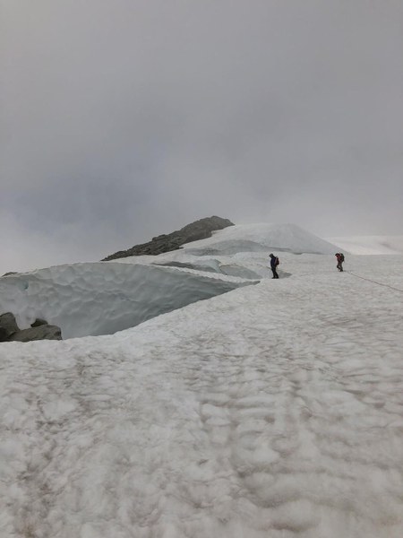 There is one main snow bridge crossing to continue up the route. Additionally there is a crevasse opening at the base of the knife edge (or not so knife edge when we were on it) that from below appears to cut into the route. It had not opened onto the top of the ridge when we crossed but care should be taken in the coming weeks.