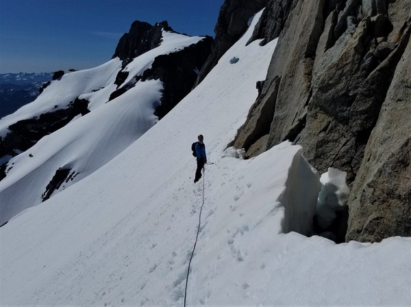 We reached the N col (also referred to as the V-notch @ 6860') and sunshine around 9am where we roped up for the 200' of steep traversing we needed to do.