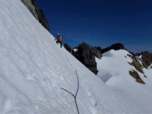 Scott sets 4 pickets with the last one at the base of our rock pitch and belays everyone in. He's just rounded the bulge in this photo, where we start our rock pitch.