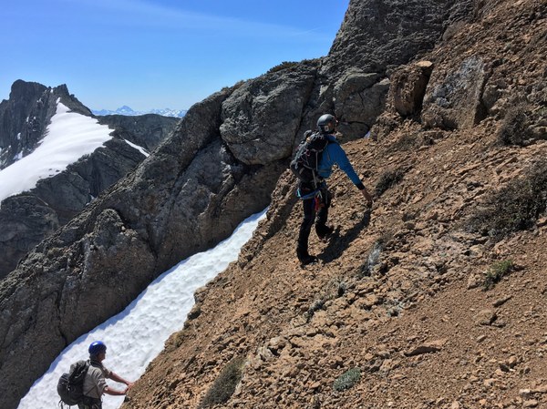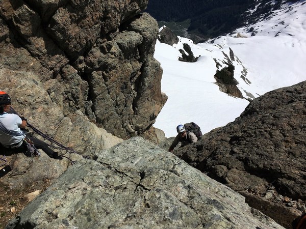 We leave new anchor materials for our rap back to the base of the rock. Scott leads out again to the col.