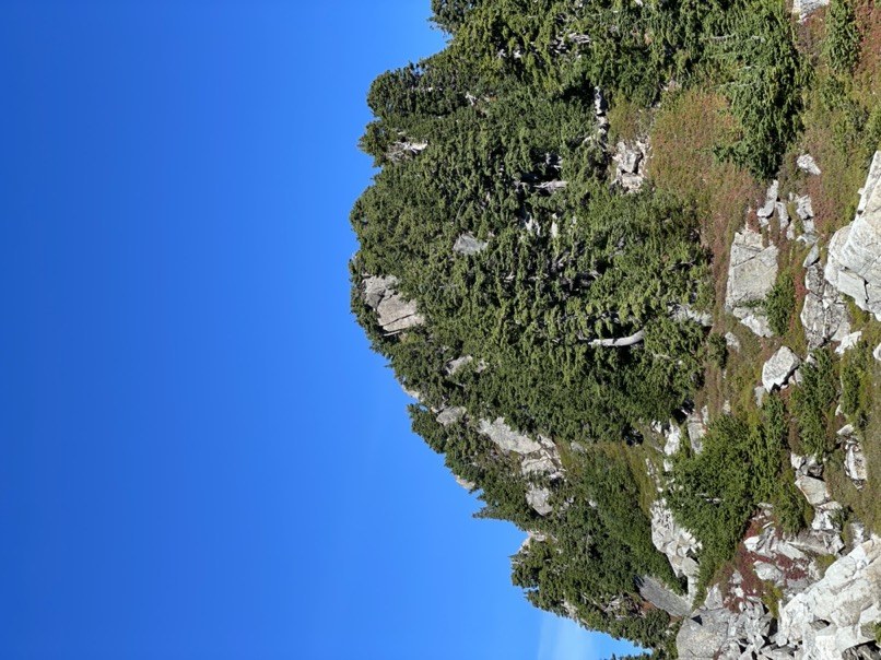 After this is s straight forward Summit push, up through rock into a meadows and to a small mound to the right. The summit is pleasant like a small park. Gorges 360 views. Summit register in the rock pile. Wind was perfect. No mosquitoes. The east face is s sharp cliff and i did not visualize lake serene, but you can see the middle peak.
