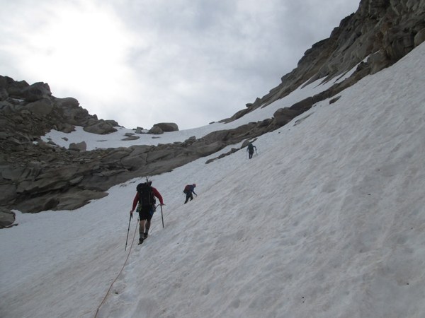 Ascent. After dropping down from Burgundy Col we stopped at the edge of the glacier to rope up and spent about an hour getting food/water/harnesses, etc. Started up the glacier around 9:00am. Glacier was in great shape, there were only a few small cracks to step over. Arrived at Silver Star Col by 10:20am. Unroped and scrambled mostly left to find easiest route to the summit. Reached summit block 11:15am. We spent about a half hour on the summit.