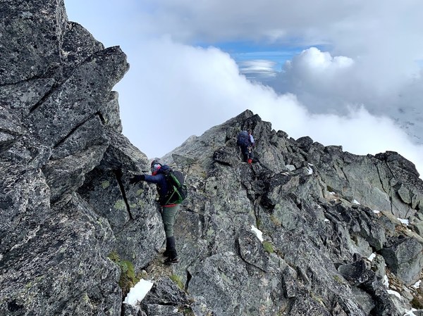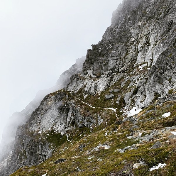 Once past the glacier, the views improved somewhat as we had climbed through one layer of fog. The corkscrew was in good shape. After reaching the end of the bootpath, head straight up the sandy gully to where it narrows (class 3). Then scramble to the summit.