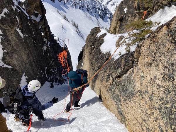 On the summit we ran into two Mountaineers on an independent climb. We joined forces for the descent. We did a single rope rappel from a tree just below the summit into the couloir. A double-rope rappel down the couloir got us past the narrow icy section. From there we downclimbed out of the couloir and headed back to the cars.