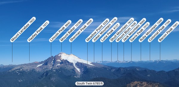 Pano of the summit area. Mt Baker, Sisters Glacier and the summit.