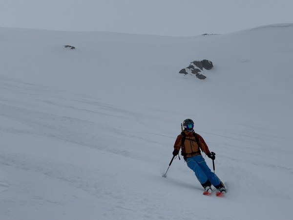 The party rendezvoused on the top of the Prow as planned, transitioned quickly, and had a fun if challenging at times ski down to the basin, with the snow transitioning from breakable crust to firm snow to corn to soft snow in the basin.
