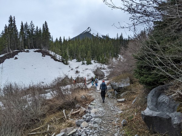 The approach trail started out under a few feet of snow at the Glacier Basin TH. We (optimistically) started out skinning from the TH and worked around a few breaks and some trees/brush across the trail, but after a half-mile or so and with long breaks in skinnable snow, we put skis on packs and hiked in our boots. At about 1.5 miles in, continuous snow resumed with about half the party skinning and half continuing in boots. Trail runners (possibly with microspikes) might have been good up to Glacier Basin, but rough and alternately soft and icy snow made boots a good choice for travel. A couple of narrow snow bridges over creeks that were skinnable on the way in had been stomped/chopped into more manageable shape by the time we exited in the afternoon.