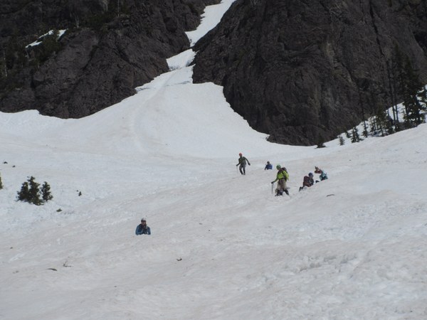 GEAR: We planned it as three glacier style rope teams (3 in a team), so we brought a glacier rope and two pickets per team. There hadn't been any recent trip reports, so we didn't know what to expect. Each individual had helmet, harness, belay device, prusik, a few runners and 'biners, crampons, and ice axe. -- We ended up using one rope as a handline with prusiks because we got off route in the wrong gully once. We did not need the crampons. But we had enough gear to keep ourselves out of trouble without being too heavy.