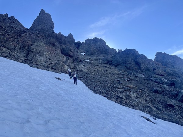 After enjoying the summit for 30 or so minutes, we were very slow and deliberate on our descent, careful not to slip or kick down loose rocks on other parties. We did not use crampons to descend the snow finger, and a few folks slipped a bit, self arresting almost immediately. Afterward we discussed whether we should have worn crampons, but in my personal opinion, the snow was too soft and probably would have led to balling up if we had been wearing them. I think that it could have made people feel more comfortable though.