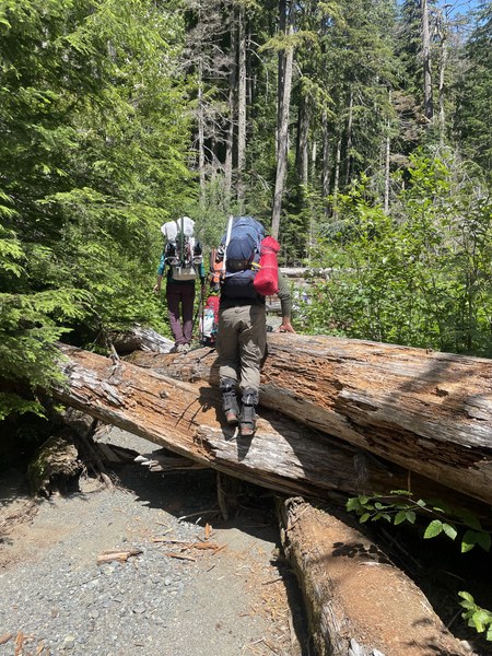 Beyond Lena Lake the trail starts to look less like a highway and more like a climber's trail. The trail goes over several downed trees and crosses dry streambeds as it meanders up the valley, barely gaining any elevation for a couple miles. A WTA crew had recently been through and flagged the entire path, making navigation easy. Streams were easily crossed using logs or rocks (a couple of us waded through because we were hot.) We arrived camp at around 3100' at 2:30 PM, ate dinner, and went to bed early. We didn't encounter any descending climbers on our way up, so we weren't able to get a sense for current conditions.