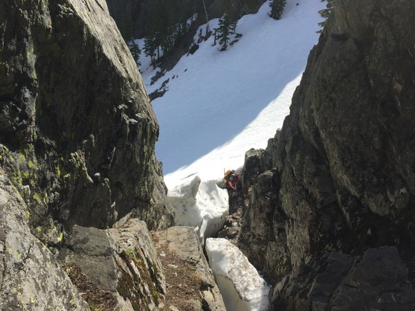 On the other side of the pass, the "high road" option was melted out but we chose the "low road" squeezing into a moat between hard snow and the rock wall. After that was a section of hard snow which we walked on with ice axes but no crampons. The final rock scramble up as well as the climb itself were snow free.