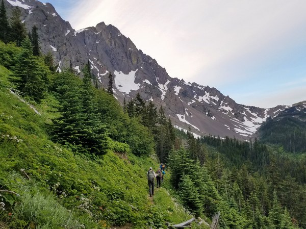 An excellent alpine experience in the Olympics with a little bit of everything: groomed trail through movie-set like old growth (check); idyllic camping in flowered meadow (check); 2000 ft plus elevation gain through talus/scree hell and steep snow (check); fourth class rock finish with heart-stopping views (check).