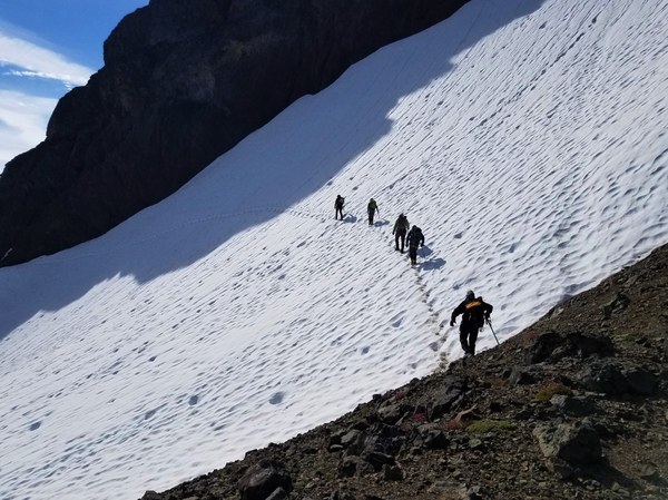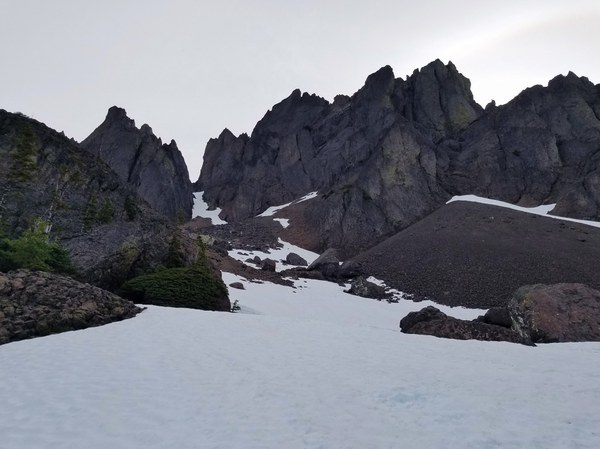 Almost all of the approach, with the exception of the last approximately 2 miles, is on maintained trail. The last push to the summit, however, is a mix of talus, scree and (as of this writing) steep snow through which you will gain more than 2000 feet in elevation. Currently the snow conditions will allow you to access the easier scramble route on the far east side summit block rather than having to ascend very steep snow (with a very long and unsavory looking run-out) to gain the unprotectable face climb. Questionable how long this other option will last given the growing moat problem on that east side.