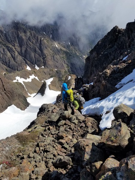 Once at the saddle, we took a view and the options to gain the southeast summit. The choice was pretty clear to go for the far eastern side scramble route, traversing the snow, rather than try and go further up the snow for the face climb, which the last known party had attempted.