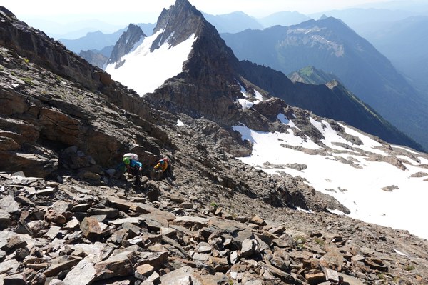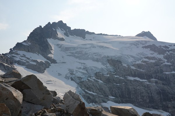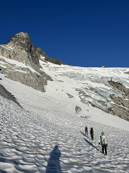 No issues on the drive and the approach to Boulder Pass. The campsite at Boulder Pass was snow free and we had it all to ourselves. There was water from snow fields just below the pass both on the south and the north sides. Snow free traverse from the pass to the glacier (possible to take either the high route directly from the pass, or drop below on the trail for a couple 100 feet and then traverse up toward the ridge, which we did). The Walrus Glacier was in good shape but required some steep climbing to get onto the upper glacier. The scramble to the summit was a hands-in-pockets walkup - once we got on the correct route!