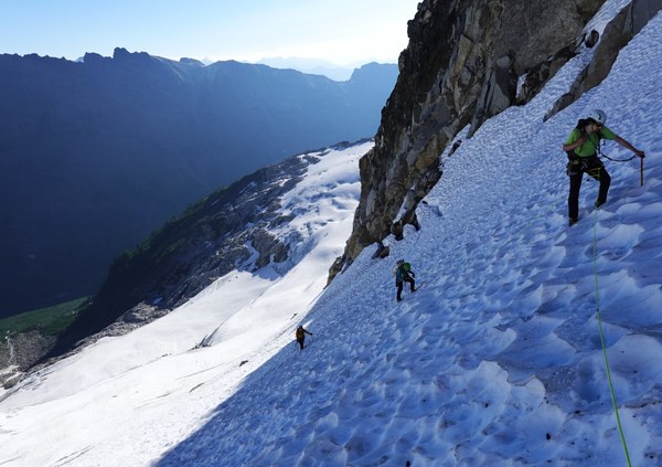The descent of the steep glacier pitch did feel steeper than on the way up (I know it comes as a shock) but also pretty secure thanks to the soft but not too soft snow. We deployed and redeployed our 4 pickets to make it feel comfy. The pickets were so secure that it was sometimes hard to harvest them back out of the snow.