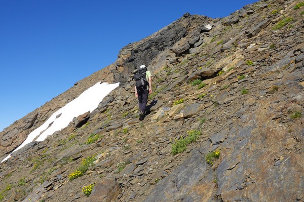 We dropped back down and rounded the corner toward the scramble route, and found the easy and floriferous class 2 walkup to the summit.