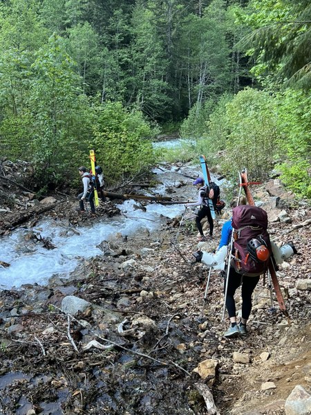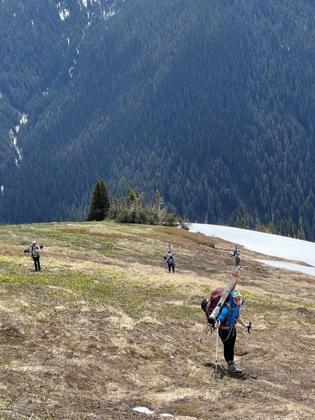 Upon getting above treeline we observed that the snow was largely melted up to the ridge separately the river valley from the White Chuck Basin, our intended ski route into our planned camp close to Glacier Gap.